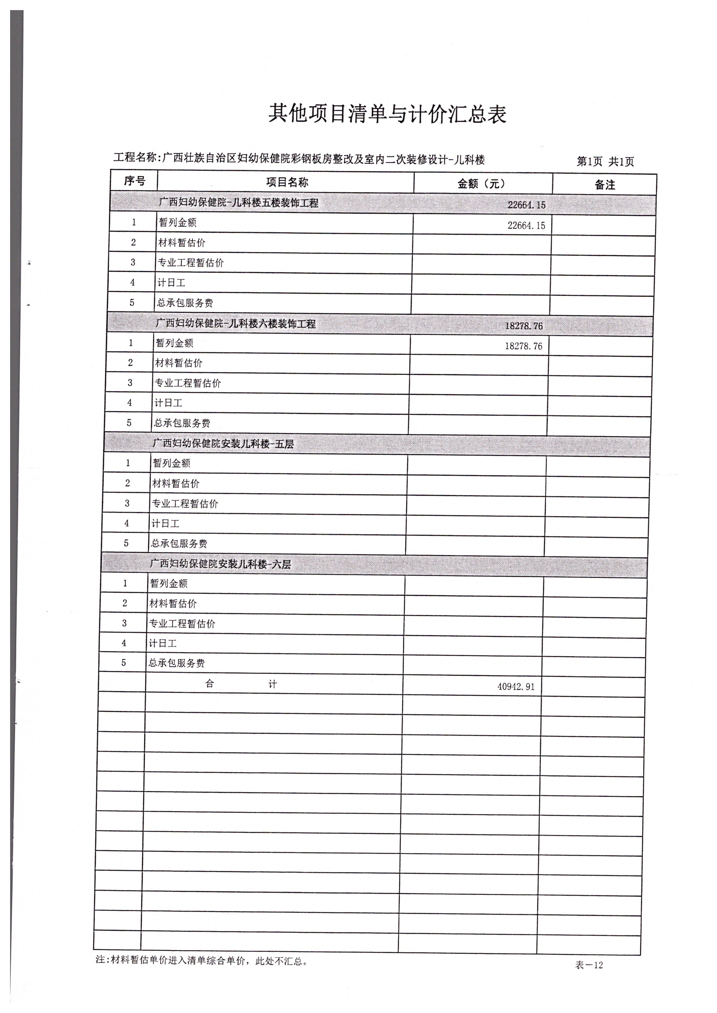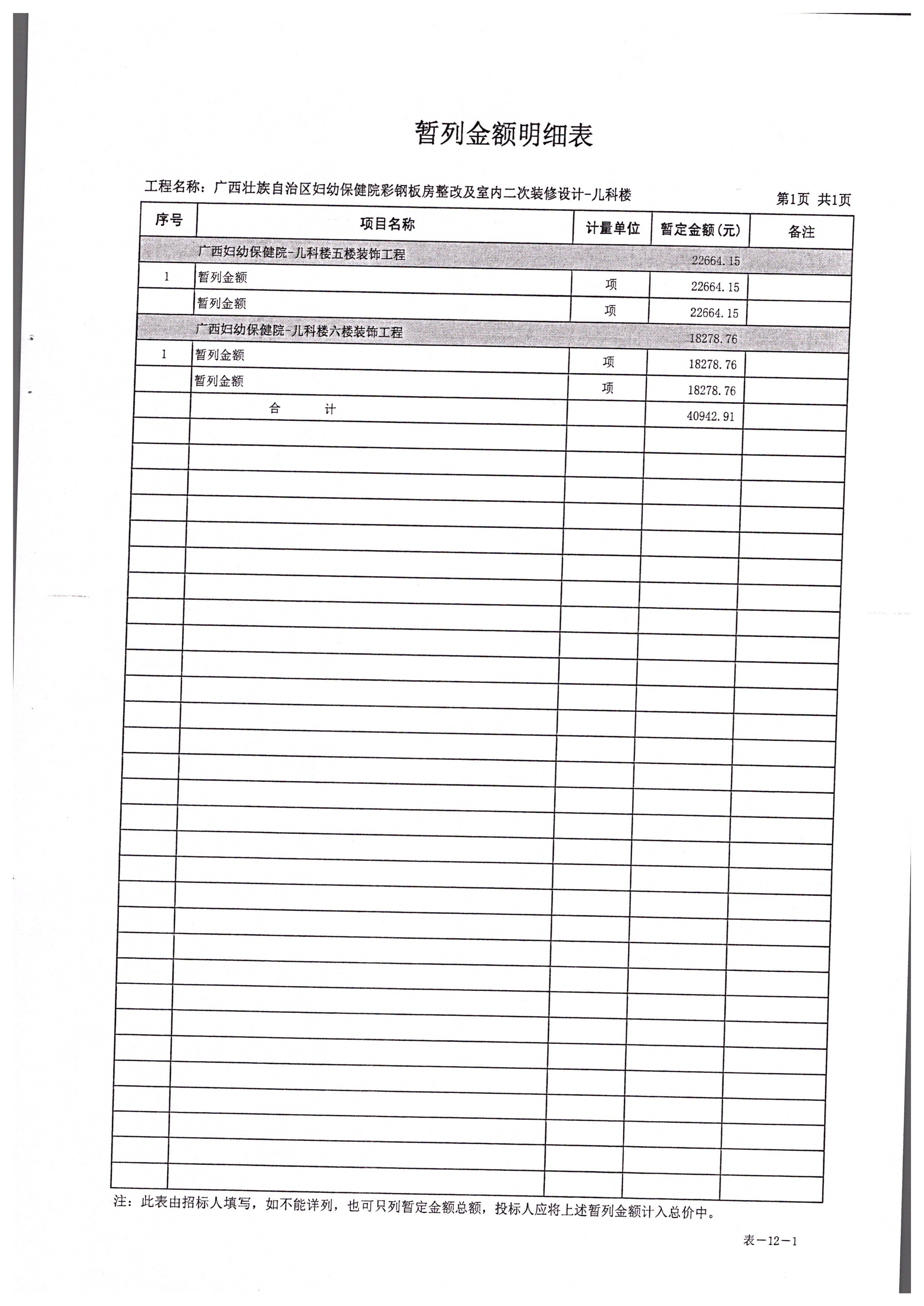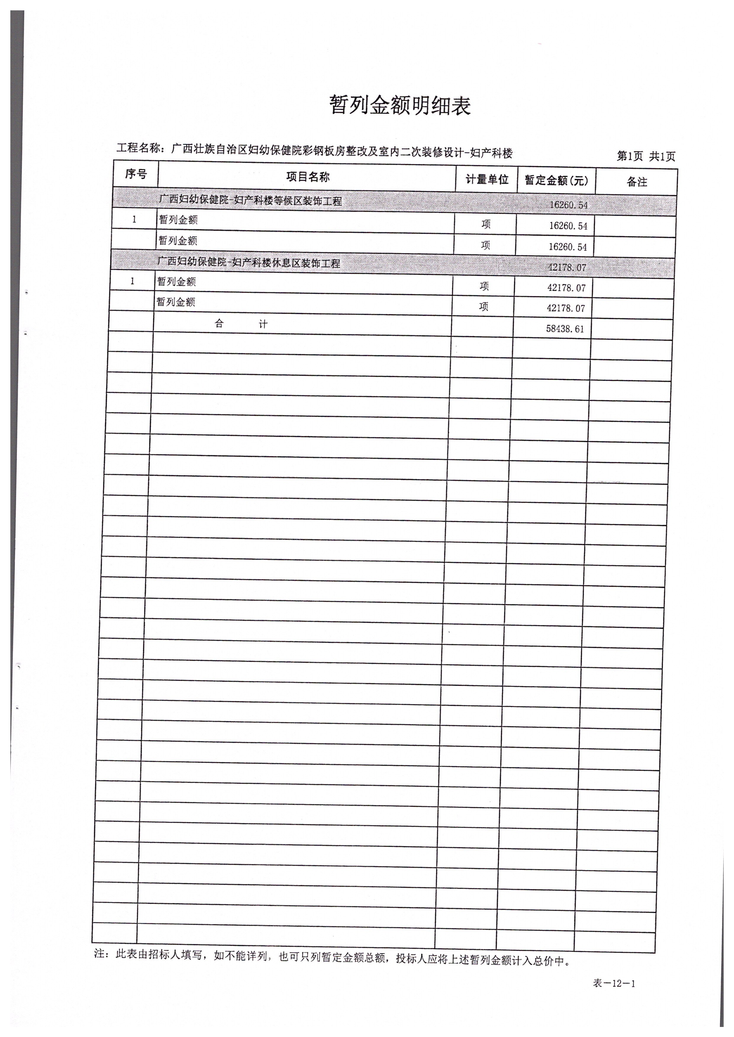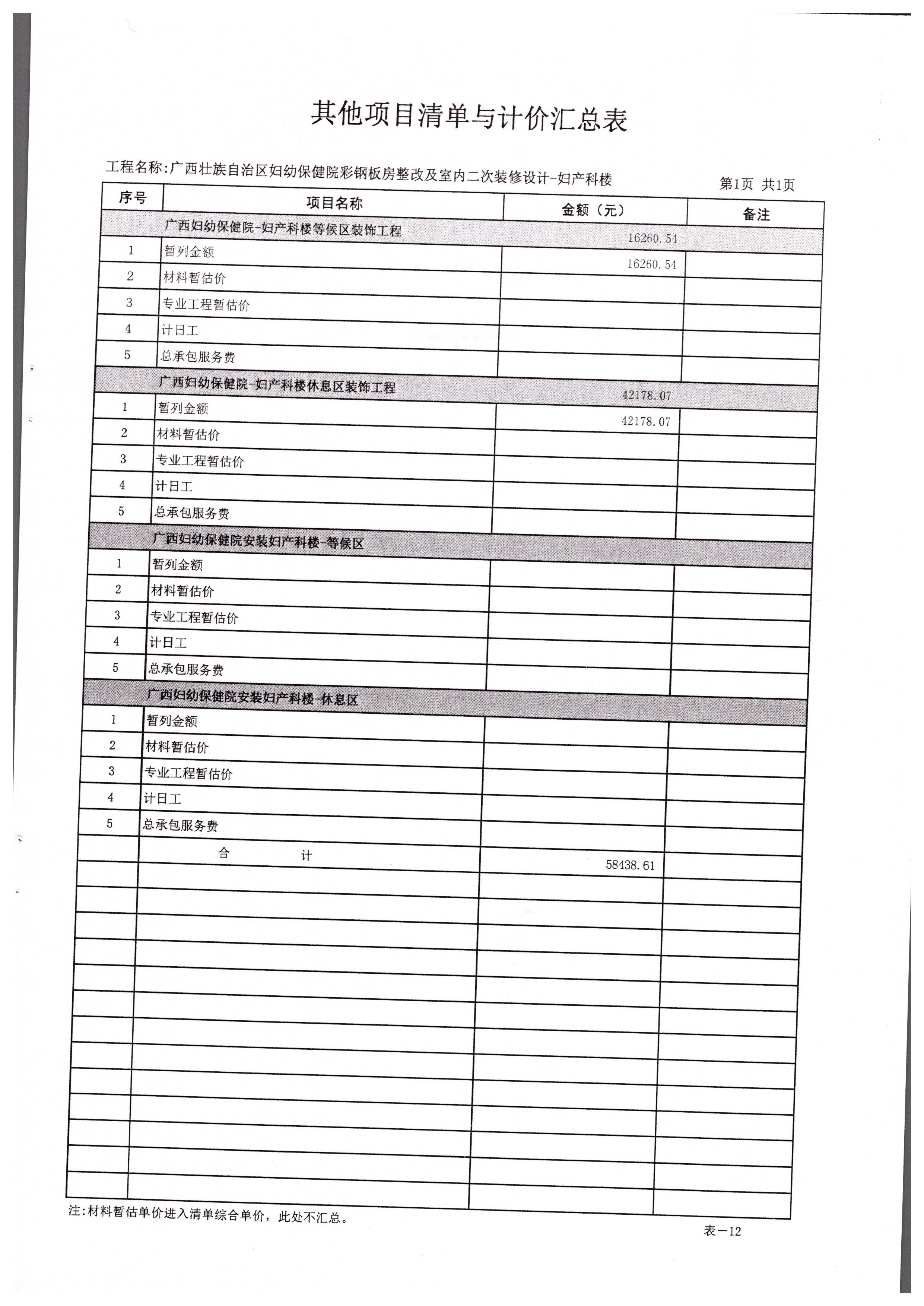 各供应商: 一、项目名称:广西壮族自治区妇幼保健院儿科楼、妇产科楼室内二次装修 工程 二、项目编号: GXKLJ20192515 三、采购人名称:广西壮族自治区妇幼保健院 地址:广西南宁市新阳路225号 联系人:杨工;联系电话:0771-2860979 四、采购代理机构名称:广西科联招标中心有限公司 地址:南宁市大学东路170号 项目联系人:杨工;联系电话: 0771-2203960 三、本项目招标工程量清单补充内容如下: 增加表-12(其他项目清单与计价汇总表)、表-12-1(暂列金额明细表),具体内容详见本通知附件。 其他内容不变,特此通知。